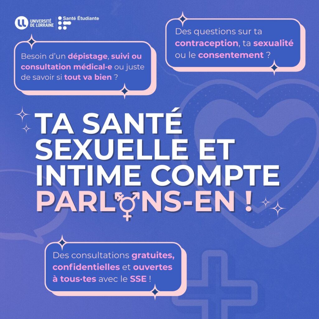Le Service de Santé Etudiante (SSE) de l’Université de Lorraine vous rappelle qu’il existe des consultations faites pour vous, étudiantes et étudiants. Un espace bienveillant et sans jugement pour parler de tout ce qui vous préoccupe : votre corps, la contraception, les infections, les règles douloureuses, la sexualité… Nos professionnel·les sont là pour vous écouter et vous conseiller. Alors, n’hésitez plus, prenez rendez-vous et prenez soin de vous…