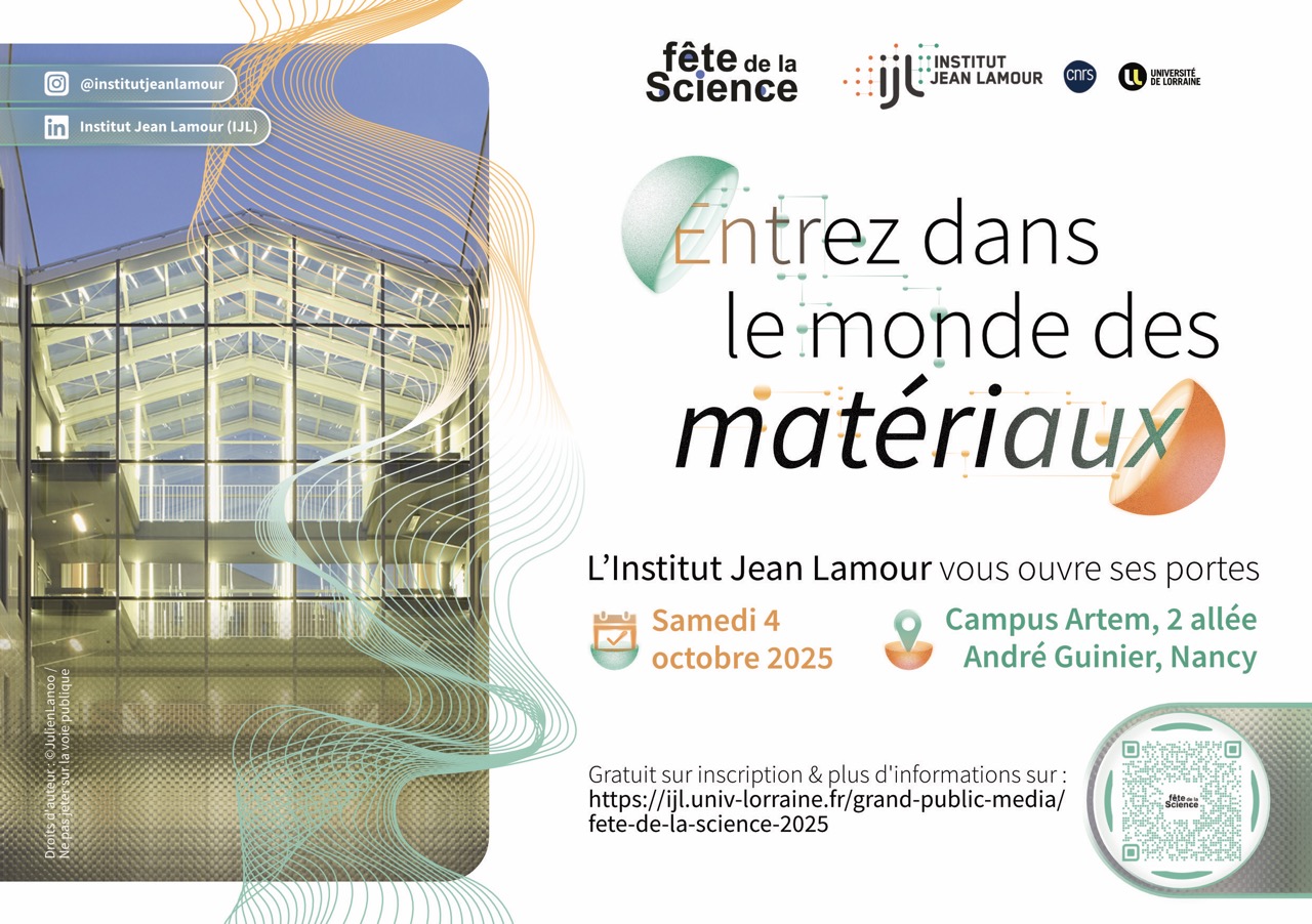 L’Institut Jean Lamour vous ouvre ses portes le samedi 4 octobre 2025 : l'entrée est gratuite mais la réservation est obligatoire. Venez découvrir la recherche sur les matériaux, un domaine passionnant qui vise à identifier leurs propriétés à l’échelle atomique, moléculaire et macroscopique. Elle ouvre la voie à la conception de nouveaux matériaux, appelés à jouer un rôle clé dans des secteurs majeurs tels que l’énergie, la communication, la mobilité ou encore la santé. Personnels, étudiants, chercheurs et enseignants-chercheurs vous accueilleront pour vous faire découvrir notre institut…