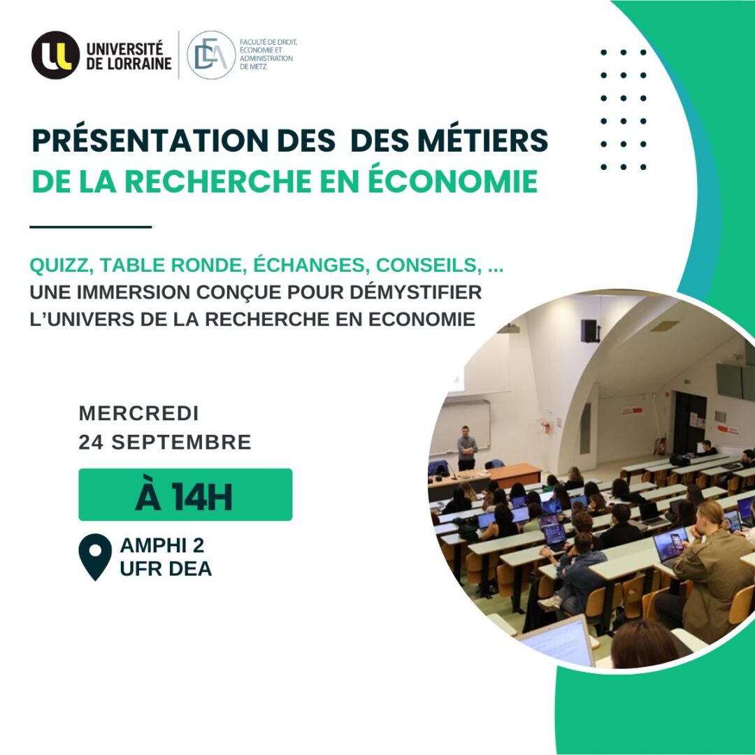 Dans le cadre de la semaine de la recherche, la faculté de droit, économie et administration de Metz organise le Mercredi 24 septembre 2025 de 14h à 16h, en Amphi 2, un moment d'immersion exceptionnelle destinée aux étudiants en économie de L2, M1 et M2, conçue pour démystifier l'univers de la recherche et éveiller les vocations scientifiques. Cette manifestation unique débutera par un quiz interactif permettant de confronter de manière ludique les représentations sur la recherche économique et ses débouchés professionnels. Elle se poursuivra par une table ronde enrichissante réunissant trois…