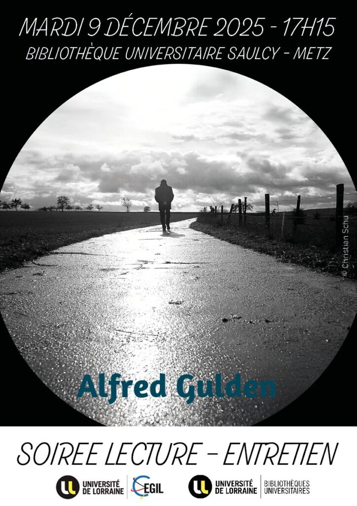 Entrée libre et gratuite SOIREE LECTURE – ENTRETIENAVEC Alfred Gulden documentariste, écrivain, dramaturge, poète et chansonnier. Originaire de la Sarre, il vit à Sarrelouis et à Munich. Son œuvre variée jette des ponts pour dépasser les frontières et approcher l’être humain. Christian Schu photographe, vidéaste et réalisateur indépendant né à Sarrelouis. Il collabore depuis de nombreuses années avec le poète et cinéaste Alfred Gulden, notamment comme chef-opérateur ou photographe sur ses films et projets artistiques. Traducteurs et lecteurs Marie Coronel étudiante M1 trinational…