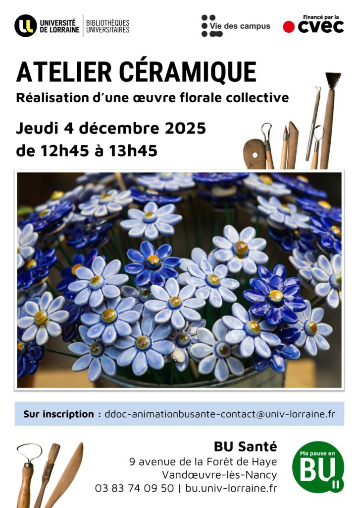 La BU Santé vous propose un atelier céramique, le jeudi 4 décembre 2025, de 12h45 à 13h45. Avec Béatrice Allard, artiste céramiste, vous découvrirez les techniques de modelage afin de façonner deux fleurs et contribuer à une création florale collective qui sera ensuite exposée dans la bibliothèque. Réservé aux étudiant-es, sur inscription : ddoc-animationbusante-contact@univ-lorraine.fr