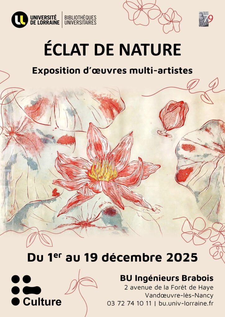 La bibliothèque universitaire ingénieurs Brabois vous propose l’exposition « Eclat de nature » du 1er au 19 décembre 2025. Les œuvres choisies portent en elles des sensibilités différentes et montrent des techniques variées (aquarelle, eau forte, gravures, lithographies, peinture à l’huile, photographies). L'objectif de cette exposition est de vous laisser découvrir une variété de techniques et de compositions artistiques sur le thème universel de la nature. Vous pourrez découvrir les tableaux des artistes suivants : Tony Cragg, Vincent Gagliardi, Amandine Gollé, Marina Haccoun Levikoff, Eric…