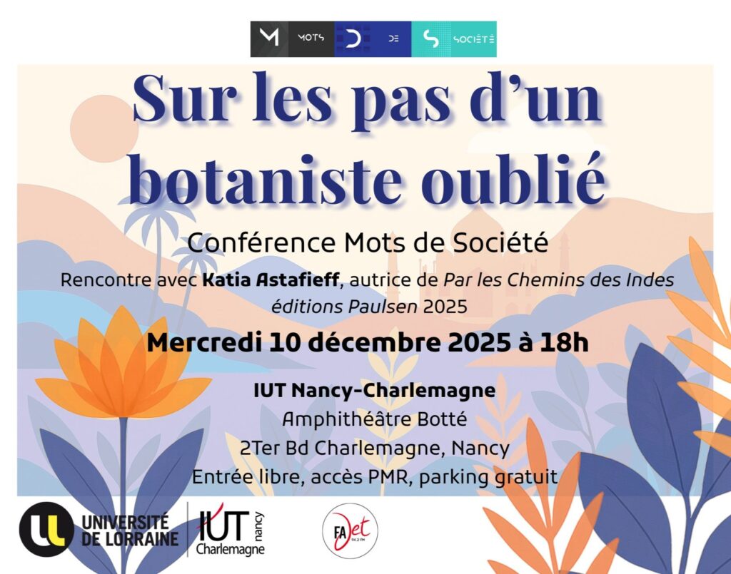 L’autrice Katia Astafieff est conviée par l’IUT Nancy-Charlemagne pour son dernier livre Par le chemin des Indes publié aux éditions Paulsen. Cette rencontre s’inscrit dans le cycle de conférences Mots de Société. Elle a lieu le mercredi 10 décembre 2025 à 18h à l’IUT dans l'amphithéâtre Botté. Le livre retrace le voyage du botaniste Victor Jacquemont et rassemble des trésors botaniques et géologiques. Katia Astafieff, également grande voyageuse, est partie sur les traces de cet aventurier oublié. La conférence sera suivie d’un temps de discussion avec l’autrice, ainsi que d’une séance de…