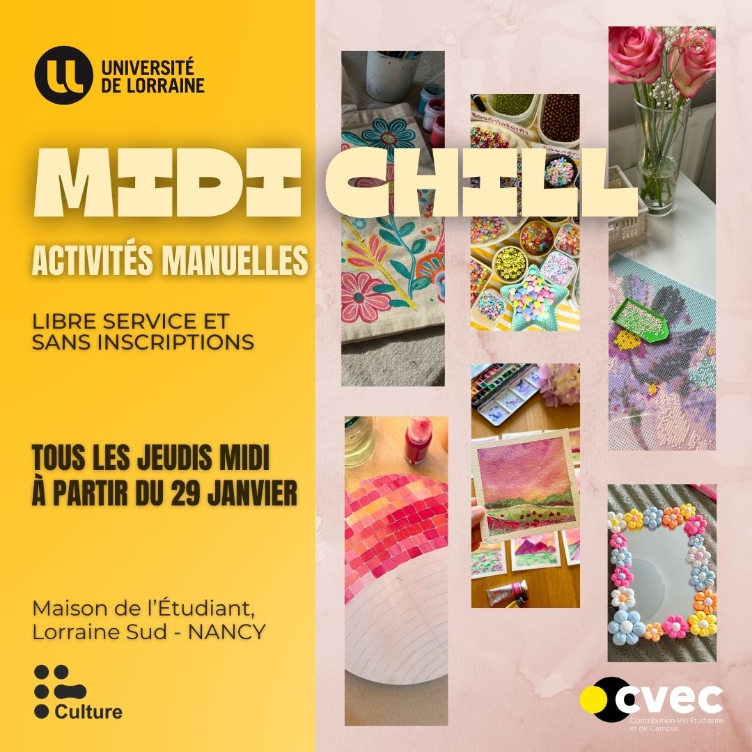Les midi-chill, c’est quoi ? Tous les jeudis midi, viens te poser autour d’une activité créative à la portée de toutes et tous afin de te détendre et passer du bon temps. Plein d’activités au programme : custom de totebags, décopatch, diamond painting, perles, aquarelle… En libre-service dans le seul but de chiller.