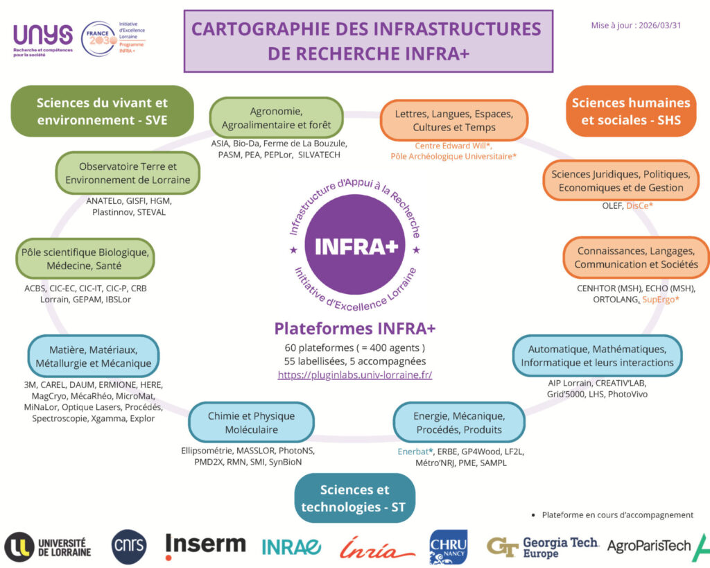 Ce portail présente l’offre des laboratoires et infrastructures de recherche (plateforme technologique, centre de compétences, plateau technique, …) en matière de recherche, compétences scientifiques et techniques, équipements, technologies et ingénierie. Cette démarche de cartographie est portée par les partenaires Unys (Université de Lorraine, CNRS, INRAE, Inria , CHRU de Nancy, AgroParisTech et Georgia Tech Lorraine) en collaboration avec l’Inserm.