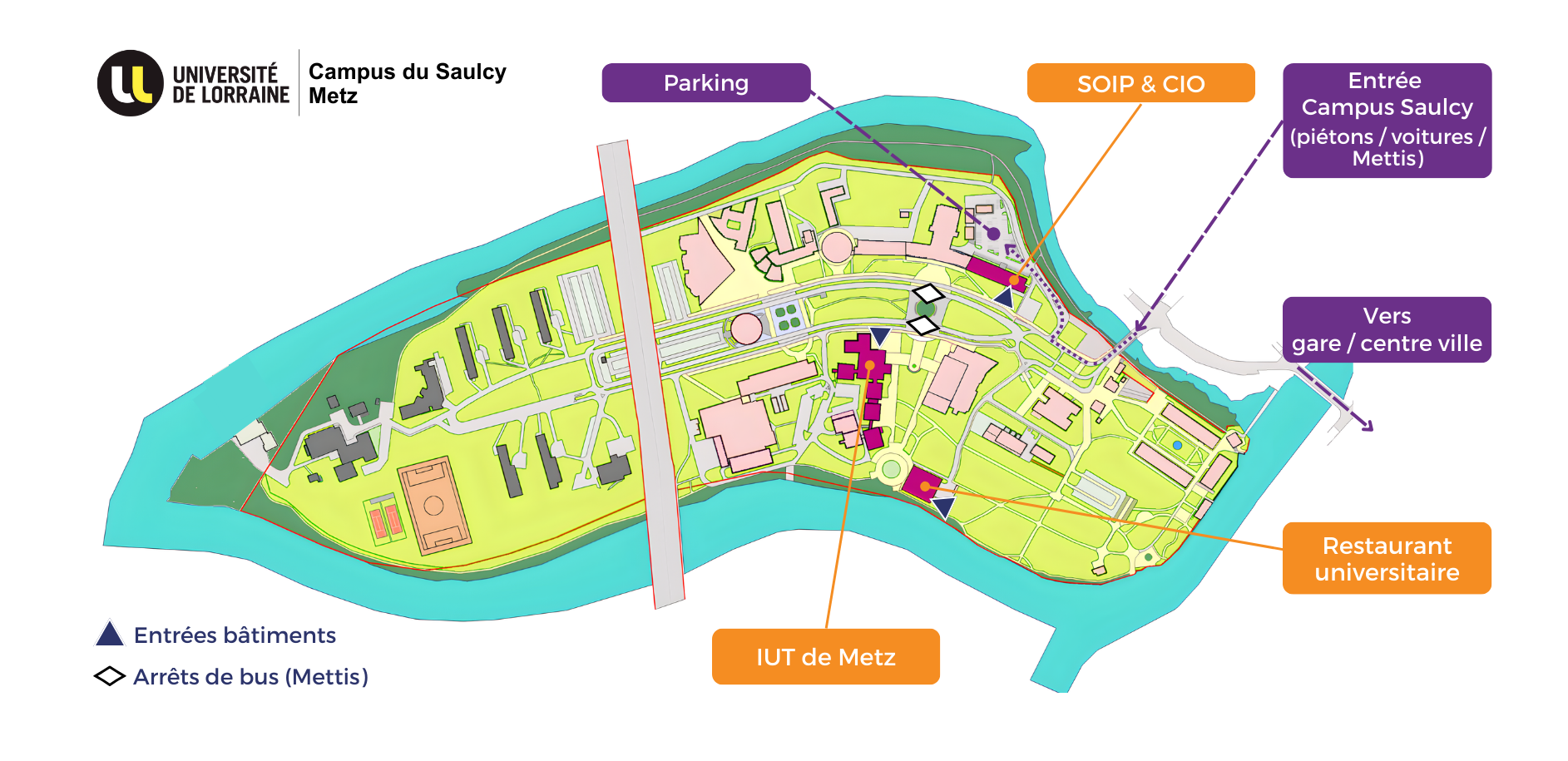 - Depuis la gare (arrêt du Mettis en face de la gare), vous pouvez prendre le Mettis B (direction Saulcy) jusqu’à l’arrêt Saulcy (sur le campus, entre la bibliothèque universitaire et l’IUT).