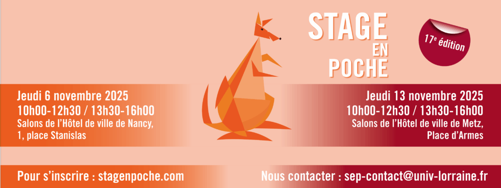 L’université de Lorraine et ses partenaires organisent la 17e édition du forum Stage en poche, un événement incontournable, qui vise à répondre aux besoins en stages des étudiantes et des étudiants et aux besoins en compétences des entreprises locales et transfrontalières !