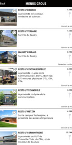 De plus, l’application UnivLorraine vous informe des menus des différents restaurants universitaires. Pour vous offrir la meilleure expérience, l’application classe ces restaurants par ordre de proximité par rapport à votre emplacement.